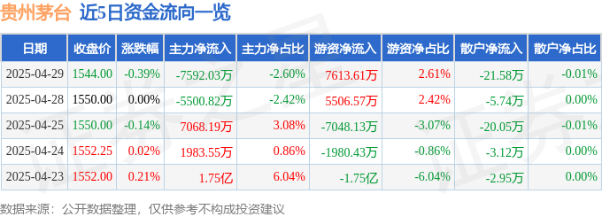 证券之星消息,截至2025年4月29日收盘,贵州茅台(600519)报收于1544.0元,下跌0.39%,换手率0.15%,成交量1.89万手,成交额29.17亿元。