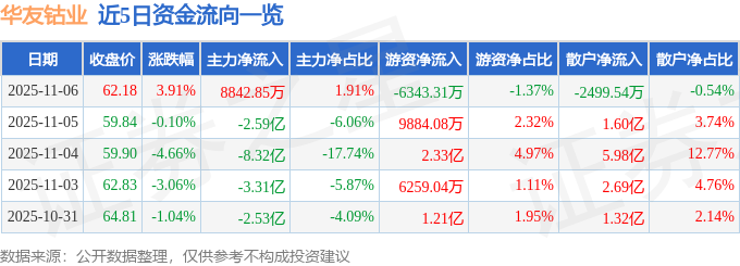 证券之星消息,截至2025年11月6日收盘,华友钴业(603799)报收于62.18元,上涨3.91%,换手率4.01%,成交量75.59万手,成交额46.39亿元。